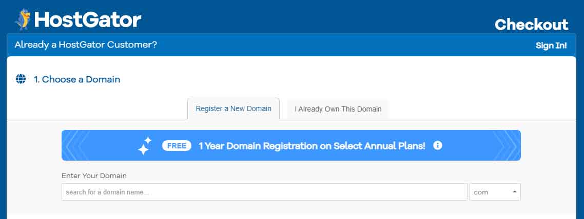 Enter the domain you would like to own and see if it's available. If it's not available, search for another closest domain name. Remember, hostgator offers free domain for a year.