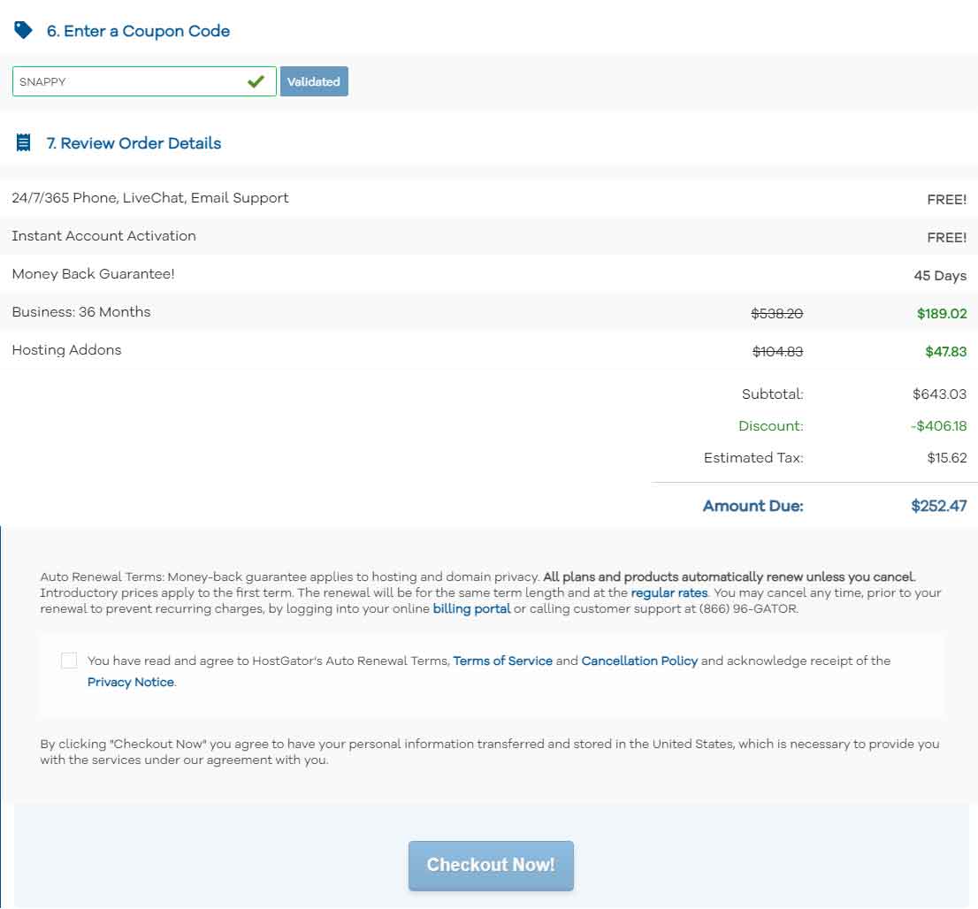 You'll get a discount coupon code by default and all you need to do is review the details and checkout. Your account will be created as a customer of hostgator and you'll receive a mail regarding account verification as well as order confirmation.